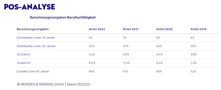 Die MORGEN & MORGEN POS-Auswertungen im Bereich BU beruhen auf mehr als einer halben Million anonymisierter Berechnungen aus den letzten zwölf Monaten. Sie zeigen nach wie vor, dass eine BU sehr häufig in jungen Jahren abgeschlossen wird. 47 Prozent der Berechnungen wurden für ein Eintrittsalter unter 30 Jahren berechnet. Das Eintrittsalter unter 18 Jahren verzeichnet jedoch einen leichten Rückgang um zwei Prozentpunkte. Auch die Berechnungen für Schüler:innen und Student:innen gingen leicht zurück. „Auch wenn es sich nur um leichte Schwankungen handelt, ist das eher verwunderlich. Auch vor dem Hintergrund, dass sich die aktuellen Angebote der Versicherer deutlich an die junge Zielgruppe wenden“, stellt Ludwig fest. Ein deutlicher Trend ist bei dem gewünschten Endalter von über 65 Jahren zu erkennen. Seit 2019 wurde diese Berechnungsvorgabe um 14 Prozentpunkte häufiger angegeben.