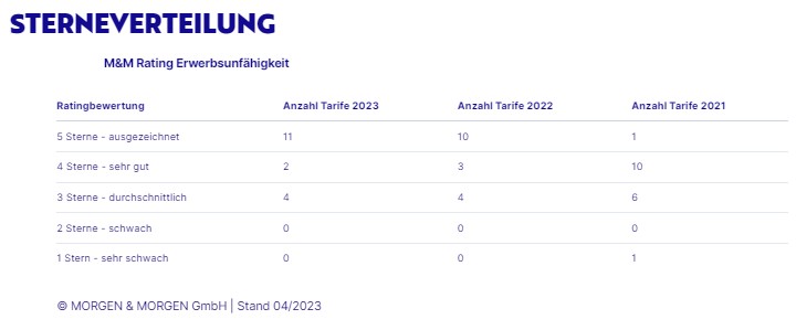 Hofheim, 19. April 2023 – Das unabhängige Analysehaus MORGEN & MORGEN attestiert in diesem Jahr im Rahmen des M&M Rating Erwerbsunfähigkeit elf Tarifen ein top Bedingungswerk. Das Angebot stagniert aktuell auf einem sehr hohen Niveau.
