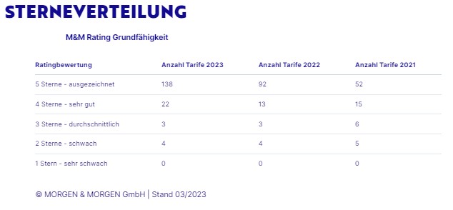 | Ratingbewertung | Anzahl Tarife 2023 | Anzahl Tarife 2022 | Anzahl Tarife 2021 |