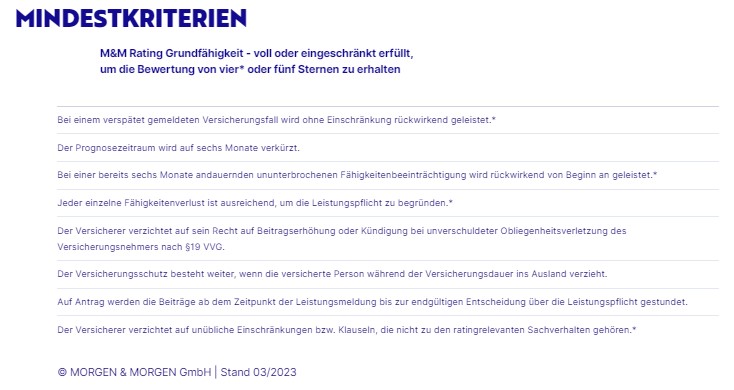 Im Fokus des Ratings liegt die Qualität und somit die Definition der einzelnen Auslöser bei Beeinträchtigung der Grundfähigkeit. MORGEN & MORGEN hat hiermit einen Standard für die einzelnen Grundfähigkeiten entwickelt. Insgesamt besteht die Bedingungsanalyse aus 69 Fragen. Davon sind 36 Fragen für das Rating relevant, die übrigen werden nachrichtlich ausgewiesen. Die ratingrelevanten Fragen beurteilen Sachverhalte und Produkteigenschaften, die als wesentlich für die Bedingungsqualität eines Produkts anzusehen sind. Die Kundenfreundlichkeit steht hier klar im Fokus, ebenso die Eindeutigkeit der Aussagen im Bedingungswerk.