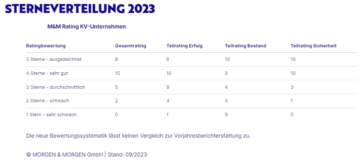 In diesem Jahr wurde das M&M Rating KV-Unternehmen überarbeitet sowie die Bewertungssystematik angepasst. Sie besteht nun aus einer Gesamtbewertung und den drei Teilratings Erfolg, Bestand und Sicherheit.