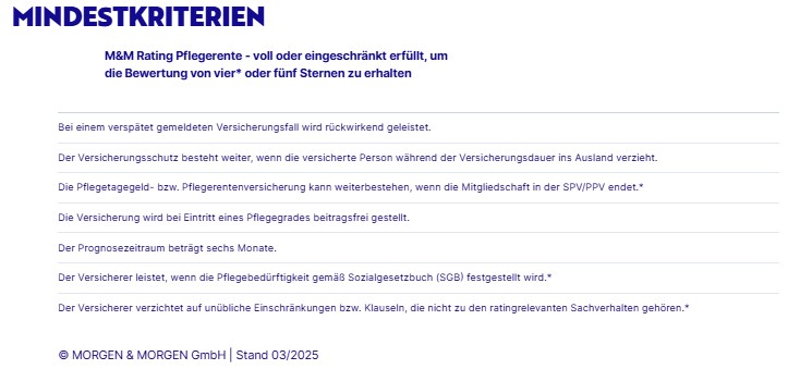 Die von MORGEN & MORGEN angesetzten Mindestkriterien stellen unter anderem sicher, dass die top bewerteten Tarife bei Vorliegen eines Pflegegrades ein Pflegetagegeld zahlen, die Beiträge bei Eintritt eines Pflegegrades freistellen, bei einer verspäteten Meldung rückwirkend zahlen, einen Versicherungsschutz auch bei Umzug ins Ausland gewährleisten und den Versicherungsschutz aufrechterhalten, auch wenn die Mitgliedschaft in der Privaten oder Sozialen Pflegeversicherung endet.
