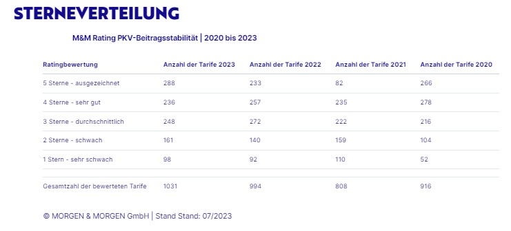 MORGEN & MORGEN untersucht im Rahmen des M&M Rating PKV-Beitragsstabilität die Tarife der Privaten Krankenvollversicherung. Hierbei werden Neugeschäftsbeiträge und Beitragsanpassungen der PKV-Tarife marktweit analysiert und zu einer Bewertung pro Tarifkombination aggregiert. Nur Tarife, die bereits seit mindestens fünf Jahren auf dem Markt sind, finden Berücksichtigung.