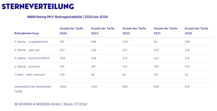MORGEN & MORGEN untersucht im Rahmen des M&M Rating PKV-Beitragsstabilität die Tarife der Privaten Krankenvollversicherung. Hierbei werden Neugeschäftsbeiträge und Beitragsanpassungen der PKV-Tarife marktweit analysiert und zu einer Bewertung pro Tarifkombination aggregiert. Nur Tarife, die bereits seit mindestens fünf Jahren auf dem Markt sind, finden Berücksichtigung.