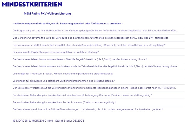 Wenn es um die Bedingungsqualität der PKV-Tarife geht, trifft das M&M Rating PKV-Vollversicherung eine belastbare Aussage und bewertet die in den Versicherungsbedingungen aufgeführten Leistungen. Das Rating besteht aus 60 Leistungsfragen. Diese Fragen beurteilen Sachverhalte und Produkteigenschaften, die als wesentlich für die Bedingungsqualität eines Produkts anzusehen sind. Die Kundenfreundlichkeit steht hier klar im Fokus, ebenso die Eindeutigkeit der Aussagen im Bedingungswerk. Die von MORGEN & MORGEN angesetzten Mindestkriterien stellen unter anderem sicher, dass die top bewerteten Tarife im ambulanten und stationären Bereich über die Regelhöchstsätze und Höchstsätze der Gebührenordnung hinaus leisten. Zudem erstatten sie bei stationärer Behandlung im Krankenhaus die Chefarztbehandlung sowie eine bessere Unterbringung in einem Ein- oder Zweibettzimmer. Die Erstattung von Prothesen, Brücken, Kronen sowie Implantaten und Inlays ist ebenfalls inbegriffen.