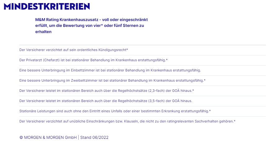 Eine Orientierung, welche der Tarife die besseren Leistungen, beziehungsweise die kundenfreundlichsten Versicherungsbedingungen enthalten, gibt das M&M Rating Krankenhauszusatz. Die von MORGEN & MORGEN angesetzten Mindestkriterien stellen unter anderem sicher, dass die top bewerteten Tarife auf ihr ordentliches Kündigungsrecht verzichten, eine Chefarztbehandlung enthalten, eine bessere Unterbringung im Ein- oder Zweibettzimmer ermöglichen, ohne Eintritt eines Unfalls oder einer bestimmten Erkrankung sowie über die 2,3-fachen sowie 3,5-fachen Regelhöchstsätze der Gebührenordnung für Ärzte (GOÄ) hinaus leisten.