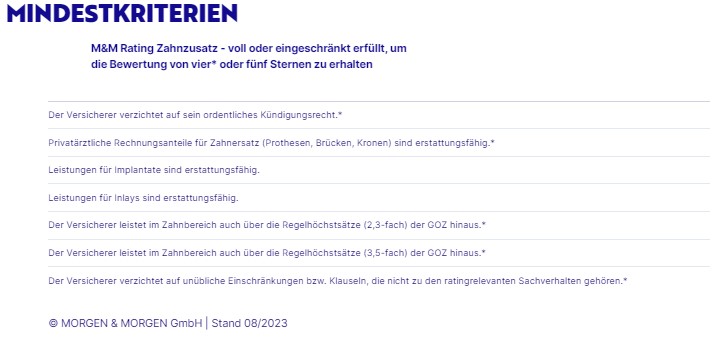 Im Rahmen des M&M Rating Zahnzusatz werden die Versicherungsbedingungen hinsichtlich kundenfreundlicher Leistungen bewertet. Die von MORGEN & MORGEN angesetzten Mindestkriterien stellen unter anderem sicher, dass die top bewerteten Tarife für Zahnersatz Implantate sowie Inlays leisten, auf ihr ordentliches Kündigungsrecht verzichten und über die 2,3-fachen Regelhöchstsätze der Gebührenordnung für Zahnärzte (GOZ) hinaus zahlen.