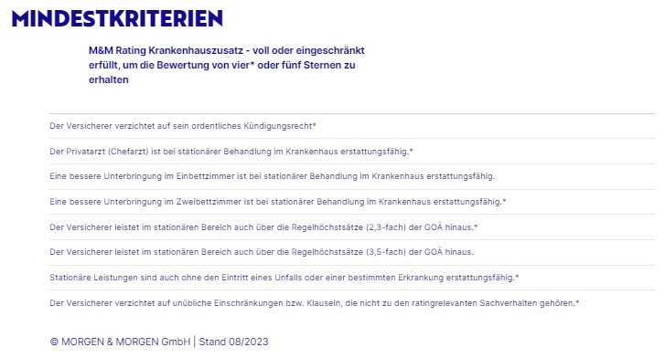 Eine Orientierung, welche der Tarife die besseren Leistungen, beziehungsweise die kundenfreundlichsten Versicherungsbedingungen enthalten, gibt das M&M Rating Krankenhauszusatz. Die von MORGEN & MORGEN angesetzten Mindestkriterien stellen unter anderem sicher, dass die top bewerteten Tarife auf ihr ordentliches Kündigungsrecht verzichten, eine Chefarztbehandlung enthalten, eine bessere Unterbringung im Ein- oder Zweibettzimmer ermöglichen, ohne Eintritt eines Unfalls oder einer bestimmten Erkrankung sowie über die 2,3-fachen sowie 3,5-fachen Regelhöchstsätze der Gebührenordnung für Ärzte (GOÄ) hinaus leisten.