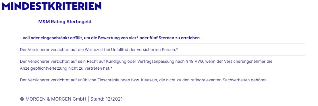 MORGEN & MORGEN analysiert die Sterbegeldtarife im Rahmen des M&M Rating Sterbegeld seit 2020. Die Bedingungsanalyse besteht aus 17 Fragen, wobei 11 Fragen ratingrelevant sind und Sachverhalte und Produkteigenschaften beurteilen, die als wesentlich für die Qualität eines Sterbegeld-Versicherungsproduktes anzusehen sind. Da es sich bei der Zielgruppe für Sterbegeldtarife in der Regel um ältere Personen handelt, liegt ein Schwerpunkt des M&M Ratings Sterbegeldversicherung bei den Themen Wartezeit und Gesundheitsprüfung. Positiv bewertet sind vor allem Tarife ohne Gesundheitsprüfung und mit angemessen kurzer Wartezeit, wobei auch Staffelregelungen Berücksichtigung finden. Zudem spielt es eine Rolle, ob die Versicherer bei Unfalltod der versicherten Person innerhalb der Wartezeit ihre volle Versicherungsleistung erbringen. Vertragliche Gestaltungsalternativen, wie Reduzierungsmöglichkeiten des Versicherungsschutzes und Überbrückungsmöglichkeiten bei Zahlungsschwierigkeiten, werden ebenfalls als wichtig angesehen. Positiven Eingang in die Beurteilung fanden Tarife, welche die Erstattung von Überführungskosten bei Versterben der versicherten Person im Ausland bieten. Pluspunkte gibt es auch für Assistanceleistungen, die in unterschiedlichem Umfang von den Unternehmen angeboten werden, wie Beratung zu Testaments- und Nachlassfragen, Digitale Nachlassverwalter, Vermittlung von Grabpflege, Vermittlung von Bestattern, um nur einige zu nennen. Ausnahmen dabei sind Tarife, die wahlweise die vollständige Auszahlung der Versicherungsleistung oder ein komplettes Servicepaket für die Bestattung anbieten, dessen Leistungen mit der Versicherungssumme verrechnet werden.