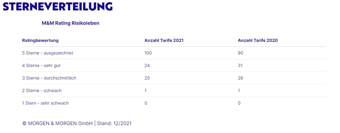 Hofheim, 1. Dezember 2021 – Die aktuellen Ratings des unabhängigen Analysehauses MORGEN & MORGEN zeigen für die Risikolebensversicherung ein hohes Bedingungsniveau mit breiter Preisrange. Das Angebot der Sterbegeldtarife geht zurück, die Bedingungsqualität der verbleibenden Tarife ist unverändert gut.