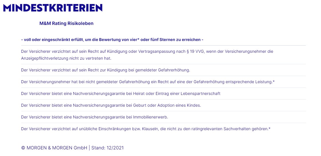 Die von MORGEN & MORGEN angesetzten Mindestkriterien stellen daher sicher, dass die top bewerteten Tarife folgende Bedingungen erfüllen: Der Versicherer sieht bei einem 5-Sterne-Tarif von der Wartezeit bei Unfalltod der versicherten Person ab. Für die Bestbewertung verzichtet der Versicherer außerdem auf eine Gesundheitsprüfung oder auf sein Recht auf Kündigung oder Vertragsanpassung nach § 19 VVG, wenn der Versicherungsnehmer die Anzeigepflichtverletzung nicht zu vertreten hat.