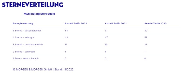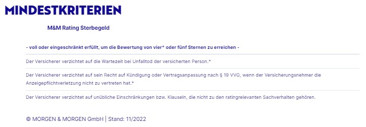 MORGEN & MORGEN analysiert die Sterbegeldtarife im Rahmen des M&M Rating Sterbegeld seit 2020. Die Bedingungsanalyse besteht aus 17 Fragen, wobei 11 Fragen ratingrelevant sind und Sachverhalte und Produkteigenschaften beurteilen, die als wesentlich für die Qualität eines Sterbegeld-Versicherungsproduktes anzusehen sind. Da es sich bei der Zielgruppe für Sterbegeldtarife in der Regel um ältere Personen handelt, liegt ein Schwerpunkt des M&M Ratings Sterbegeldversicherung bei den Themen Wartezeit und Gesundheitsprüfung. Positiv bewertet sind vor allem Tarife ohne Gesundheitsprüfung und mit angemessen kurzer Wartezeit, wobei auch Staffelregelungen Berücksichtigung finden. Zudem spielt es eine Rolle, ob die Versicherer bei Unfalltod der versicherten Person innerhalb der Wartezeit ihre volle Versicherungsleistung erbringen. Vertragliche Gestaltungsalternativen wie Reduzierungsmöglichkeiten des Versicherungsschutzes und Überbrückungsmöglichkeiten bei Zahlungsschwierigkeiten, werden ebenfalls als wichtig angesehen. Positiven Eingang in die Beurteilung fanden Tarife, welche die Erstattung von Überführungskosten bei Versterben der versicherten Person im Ausland bieten. Pluspunkte gibt es auch für Assistanceleistungen, die in unterschiedlichem Umfang von den Unternehmen angeboten werden, wie Beratung zu Testaments- und Nachlassfragen, digitale Nachlassverwalter, Vermittlung von Grabpflege, Vermittlung von Bestattern, um nur einige zu nennen. Ausnahmen dabei sind Tarife, die wahlweise die vollständige Auszahlung der Versicherungsleistung oder ein komplettes Servicepaket für die Bestattung anbieten, dessen Leistungen mit der Versicherungssumme verrechnet werden.