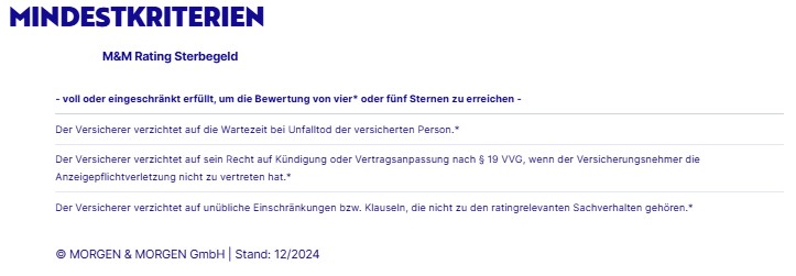 MORGEN & MORGEN analysiert die Sterbegeldtarife im Rahmen des M&M Rating Sterbegeld seit 2020. Die Bedingungsanalyse besteht aus 17 Fragen, wobei 11 Fragen ratingrelevant sind und Sachverhalte und Produkteigenschaften beurteilen, die als wesentlich für die Qualität eines Sterbegeld-Versicherungsproduktes anzusehen sind. Da es sich bei der Zielgruppe für Sterbegeldtarife in der Regel um ältere Personen handelt, liegt ein Schwerpunkt des M&M Ratings Sterbegeldversicherung bei den Themen Wartezeit und Gesundheitsprüfung. Positiv bewertet sind vor allem Tarife ohne Gesundheitsprüfung und mit angemessen kurzer Wartezeit, wobei auch Staffelregelungen Berücksichtigung finden. Zudem spielt es eine Rolle, ob die Versicherer bei Unfalltod der versicherten Person innerhalb der Wartezeit ihre volle Versicherungsleistung erbringen. Vertragliche Gestaltungsalternativen wie Reduzierungsmöglichkeiten des Versicherungsschutzes und Überbrückungsmöglichkeiten bei Zahlungsschwierigkeiten, werden ebenfalls als wichtig angesehen. Positiven Eingang in die Beurteilung fanden Tarife, welche die Erstattung von Überführungskosten bei Versterben der versicherten Person im Ausland bieten. Pluspunkte gibt es auch für Assistanceleistungen, die in unterschiedlichem Umfang von den Unternehmen angeboten werden, wie Beratung zu Testaments- und Nachlassfragen, digitale Nachlassverwalter, Vermittlung von Grabpflege, Vermittlung von Bestattern, um nur einige zu nennen. Ausnahmen dabei sind Tarife, die wahlweise die vollständige Auszahlung der Versicherungsleistung oder ein komplettes Servicepaket für die Bestattung anbieten, dessen Leistungen mit der Versicherungssumme verrechnet werden.