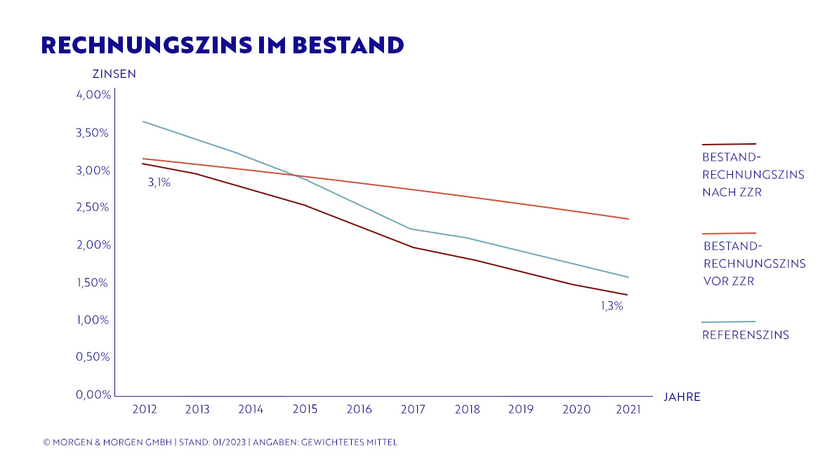 Anhand der Linie des Bestandsrechnungszinses vor ZZR ist zu erkennen, dass die Bestandsrechnungszinsen im Laufe der Jahre sinken, allein durch den Effekt, dass die Altverträge mit den hohen Rechnungszinsen auslaufen. Je nachdem, wie viele Altverträge ein Versicherer hat, wie lange diese laufen und wie viel niedrig verzinstes Neugeschäft ein Versicherer schreibt, geschieht dies unterschiedlich schnell. In den letzten Jahren hätten die Bestandsrechnungszinsen von den meisten Versicherern ohne die Zinszusatzreserve deutlich über dem Referenzzins gelegen, der wiederum die Zinsentwicklung am Kapitalmarkt der letzten 10 Jahre widerspiegelt. Dies verdeutlicht die Notwendigkeit der Zinszusatzreserve.